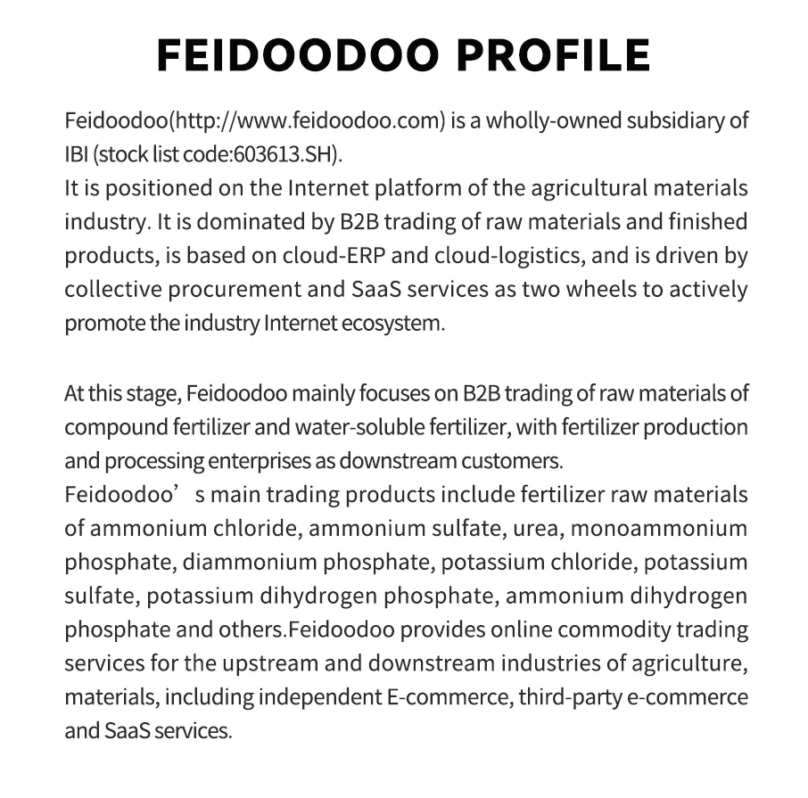 Feidoodoo Singapore(http://www.feidoodoo.com) is a wholly-owned subsidiary of IBI (stock list code:603613.SH). It is positioned on the Internet platform of the agricultural materials industry. It is dominated by B2B trading of raw materials and finished products, is based on cloud ERP and cloud logistics, and is driven by collective procurement and SaaS services as two wheels to actively promote the industry Internet ecosystem. At this stage, Feidoodoo mainly focuses on the centralized procurement of upstream raw materials and digital supply chain services, takes agricultural production and processing enterprises as downstream customers. Feidoodoo’s major trading products are fertilizers and pesticides and other related agricultural products. Fertilizers include ammonium chloride, ammo- nium sulfate, urea, monoammonium phosphate, diammonium phosphate, potassium chloride, potassium sulfate, potassium dihydrogen phosphate, ammonium dihydrogen phosphate and other raw materials; Pesticides include pesticide technical materials and formulation, like herbicide, insecticide and fungicide. Feidoodoo provides online commodity trading services for the upstream and downstream industries of agriculture, materials, inculding independent E-commerce, third-party E-com- merce and SAAS services.